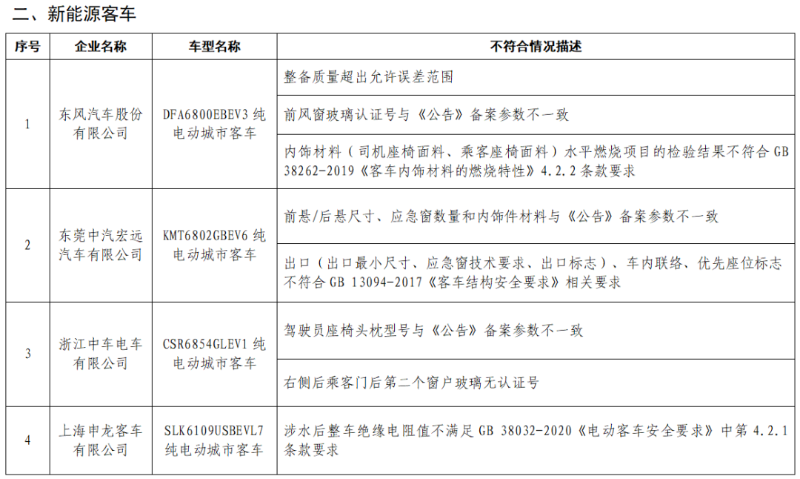 (二)新能源客車(chē),共涉及4家企業(yè)的4個(gè)車(chē)型產(chǎn)品,涉及零部件參數與《公告》備案參數不一致,內飾材料燃燒特性、涉水后整車(chē)絕緣電阻值不符合國家標準等問(wèn)題。